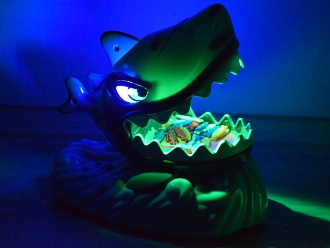 De haai met verlichte bek en ogen verhoogt de dramatiek. Veilige tanden zorgen voor zorgeloos spel.