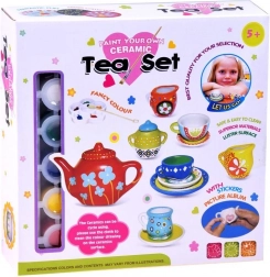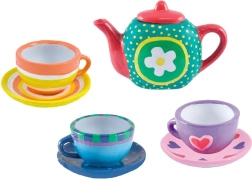 Schilder je eigen keramische theeset! Deze creatieve set voor kleine kunstenaars bevat 3 kopjes, 3 schoteltjes en een theepot plus alle benodigdheden – verf, penseel, palet en stickers. Geweldig creatief plezier voor kinderen vanaf 5 jaar en perfect voor theekransjes met poppen en knuffels.