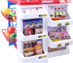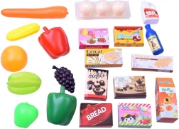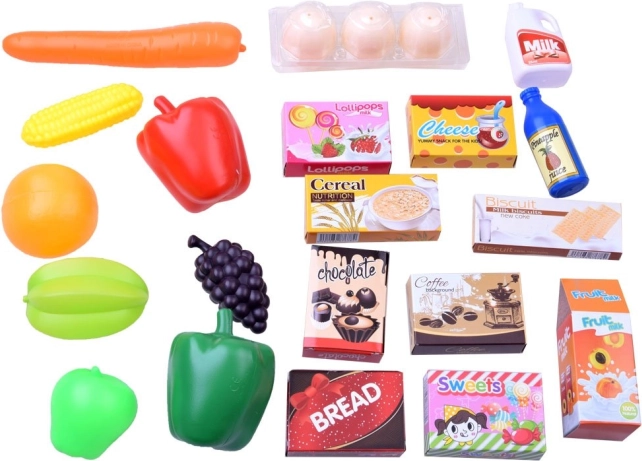 De set bevat verschillende soorten realistisch uitziend plastic voedsel, dat kinderen kunnen verkennen en gebruiken in hun denkbeeldige winkel.