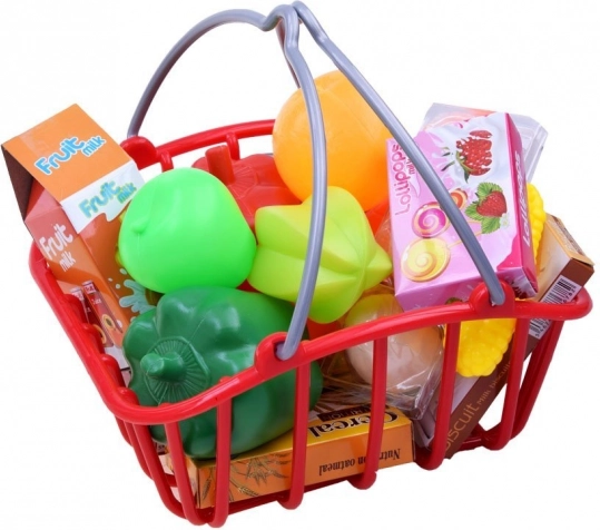 Een praktische rode mand voor het dragen van kleine spulletjes, waarmee kinderen leren hun aankopen te organiseren en te dragen.
