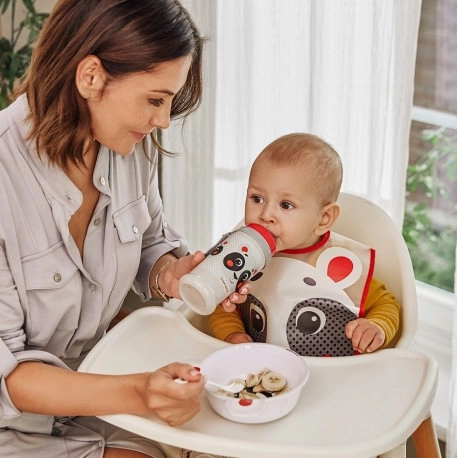 De klittenbandsluiting zorgt voor snel en comfortabel aan- en uittrekken. Je maakt de slab eenvoudig schoon met een vochtige doek of spons. Combineer met de kom en fles uit de HELLO LITTLE-collectie voor een bijpassende set.