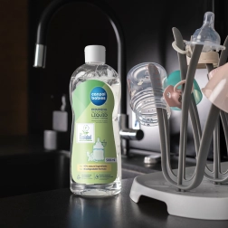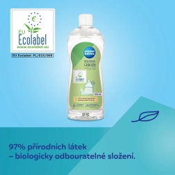Zachte maar zeer effectieve reiniger voor het dagelijks wassen van babyflessen en spenen. De samenstelling met 97% natuurlijke ingrediënten verwijdert restjes melk, pap en sappen, zonder parfums en kleurstoffen, met een neutrale pH en dermatologisch geteste formule. Biologisch afbreekbaar en gecertificeerd met het EU Ecolabel voor zachtheid voor huid en milieu.