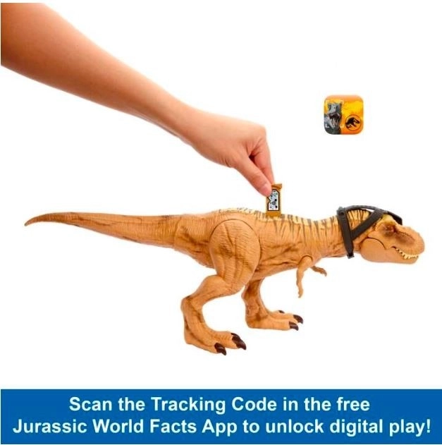 T‑Rex‑actiefiguur uit de Jurassic World-serie met realistische brulgeluiden, een nieuwe aanvalsfunctie met open bek en draaiend hoofd, en een afneembare trackingmodule voor avonturen in het veld. Met een lengte van ca. 48 cm en een hoogte van 17 cm verrukt hij dinosaurusfans van jong tot oud en biedt hij ook een uitgebreide digitale spelervaring in de Jurassic World Facts‑app na het scannen van de verborgen DNA‑tag.