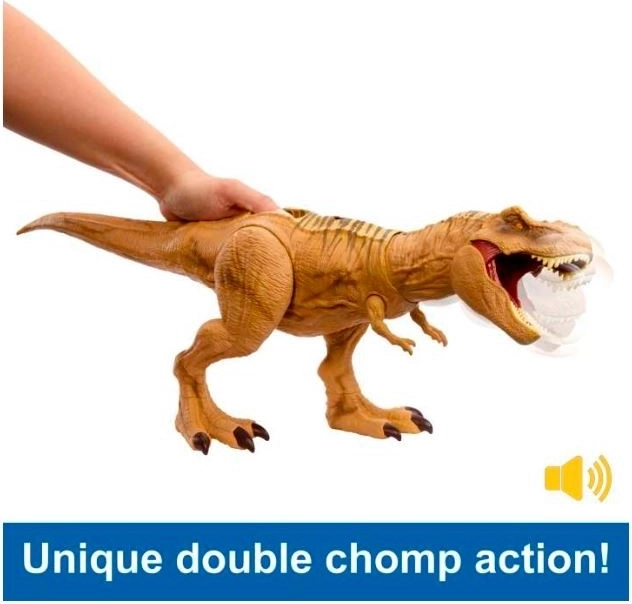 Met een druk op de knop opent de T‑Rex zijn bek en draait hij zijn hoofd opzij, begeleid door realistische dinobrulgeluiden geïnspireerd op de Jurassic World‑films.