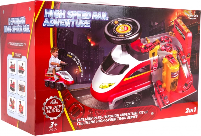 Interactieve 2-in-1 loopauto brandweer met licht en geluid, parkeergarage en 4 autootjes