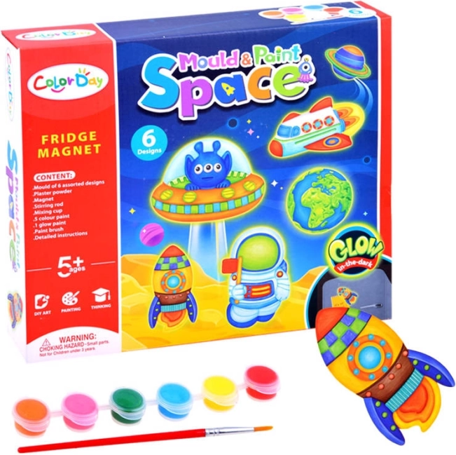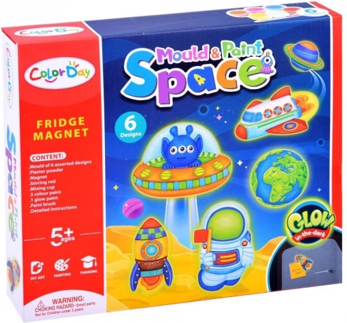 Met de bijgeleverde mallen en verf maken kinderen originele magneten met raketten, planeten en astronauten. Het knutselen is eenvoudig en leuk.