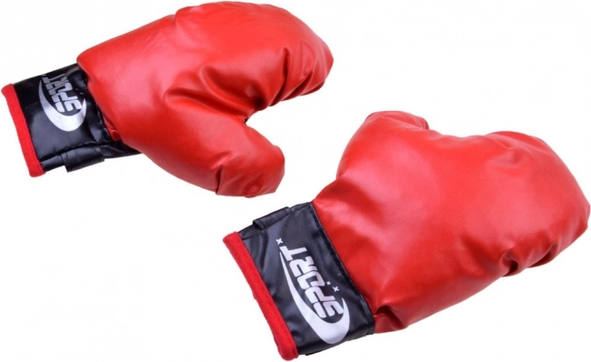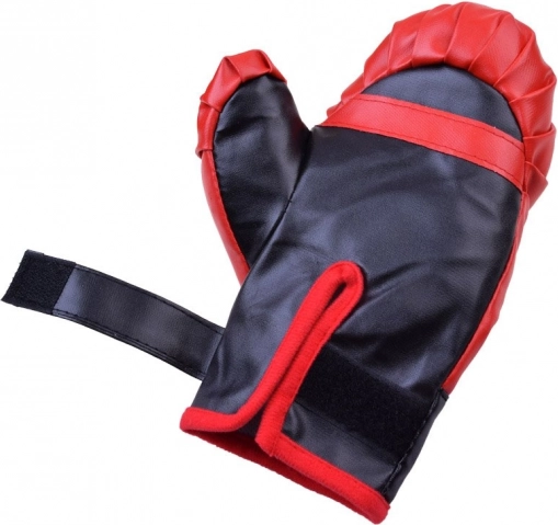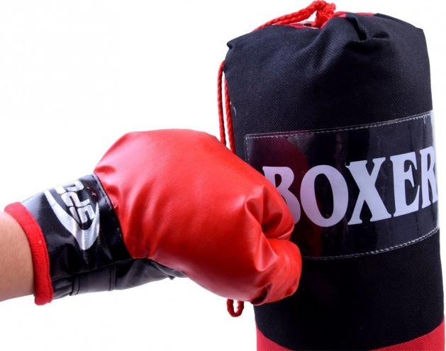 Handschoenen van synthetisch leer met klittenbandsluiting blijven goed zitten, terwijl de duurzame zak met metalen oogjes en koorden herhaalde impact doorstaat. De set ondersteunt de ontwikkeling van bewegingscoördinatie, reactievermogen en het vermogen om slagen te ontwijken.