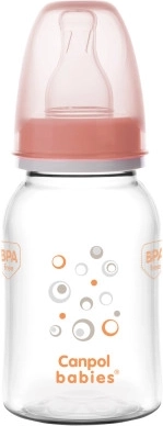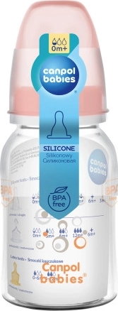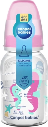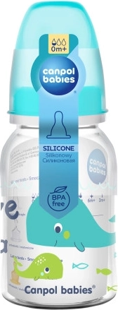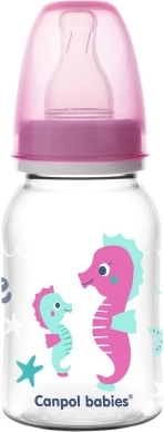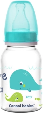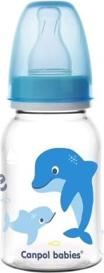 Lichte en veilige babyfles Canpol babies met een inhoud van 120 ml van hoogwaardige polypropyleen is BPA-vrij, heeft een ronde siliconenspeen met langzame doorstroom en is versierd met schattige motieven uit de LOVE & SEA-collectie. Ideaal voor pasgeborenen en dagelijks voeden.