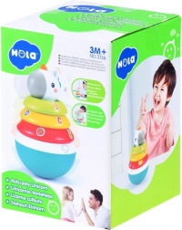 De piramide bevat drie ringen van verschillende groottes die als rammelaars dienen. Dankzij het kleine formaat kan het kind ze gemakkelijk met de vingertjes vastpakken.