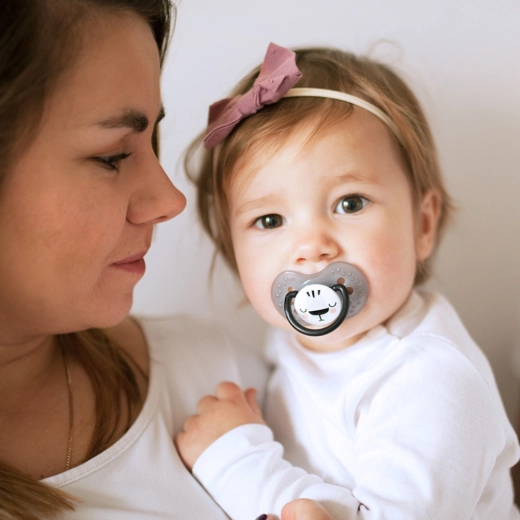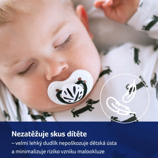 De meerlaagse siliconen speen past zich aan het zuigritme aan, ondersteunt een gezonde ontwikkeling van het gehemelte en vervormt de beet niet.