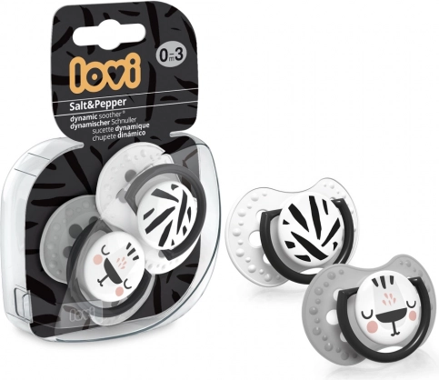 Twee fopspenen in elegant zwart-wit met dierenmotieven en een praktische ring. Ideaal om dagelijks af te wisselen.