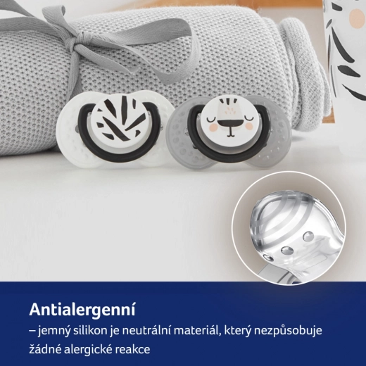 Het ergonomisch gevormde, ingesneden schild met grote ventilatieopeningen maakt vrij ademen door de neus mogelijk en beperkt speekselophoping, waardoor irritatie van de gevoelige huid wordt voorkomen. Veilige siliconen zijn smaak- en geurloos, gemakkelijk te reinigen en gaan lang mee. De praktische ringgreep vergemakkelijkt aanreiken en het bevestigen van een ketting, het reis-etui houdt fopspenen hygiënisch schoon.