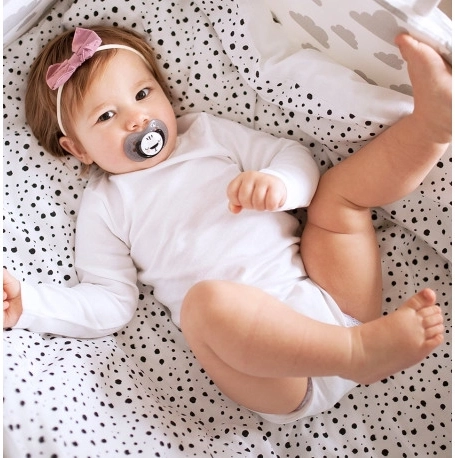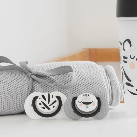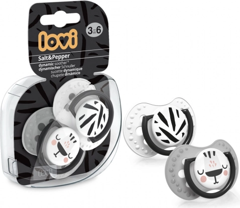 De verpakking bevat twee fopspenen in Salt & Pepper-stijl en een hygiënisch etui voor schone en veilige opslag thuis en onderweg.