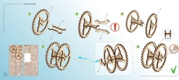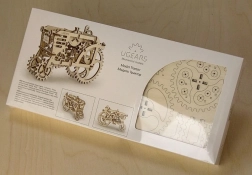 Het model wordt aangedreven door een rubberbandmotor en biedt drie modi: “parkeren”, “rijden” en “sport”, waarin de tractor op volle kracht vertrekt. Bij correct onderhoud (het insmeren van geselecteerde delen met was) geniet je van een vloeiende werking en een lange levensduur. De bouwset ontwikkelt fijne motoriek, geduld en inzicht in mechanica.