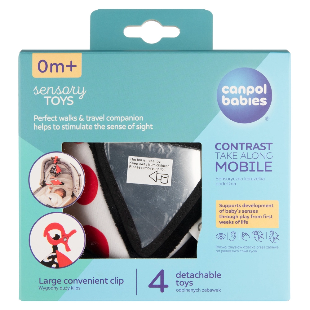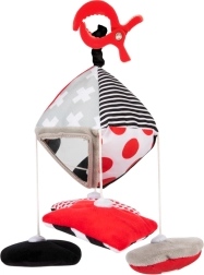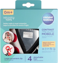 Het contrasterende hangspeeltje Canpol babies SENSORY is ontworpen voor de allerkleinsten vanaf 0+. Het hoge kleurcontrast (zwart, wit, rood) ondersteunt de natuurlijke ontwikkeling van het zicht, terwijl diverse texturen, geluiden en veilige spiegeltjes de nieuwsgierigheid en concentratie bevorderen. Dankzij de clip bevestig je het gemakkelijk thuis en onderweg.