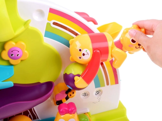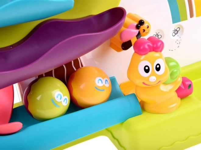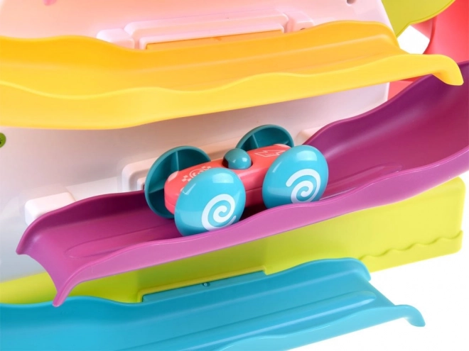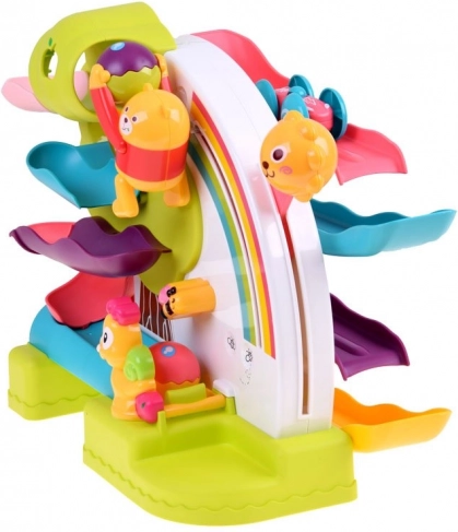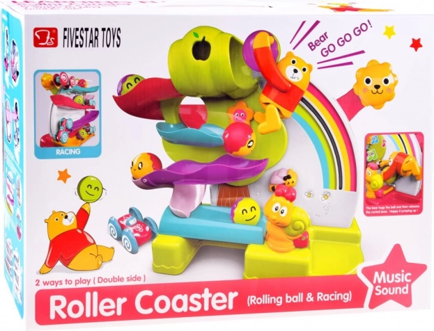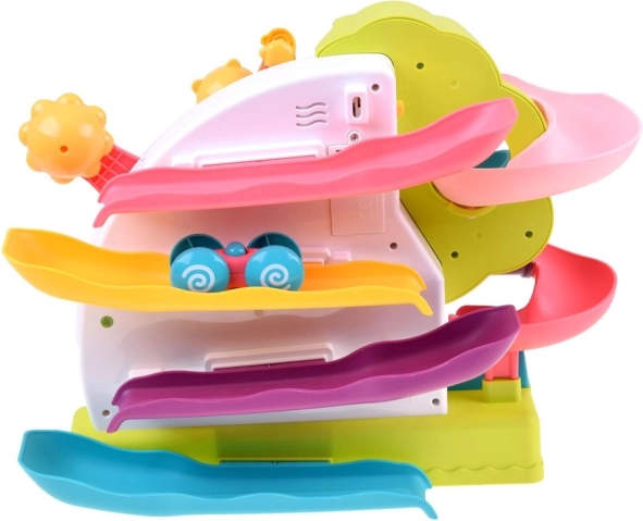De interactieve 2-in-1 baan valt op door levendige kleuren, schattige figuurtjes en pakkende effecten. In de knikkermodus verplaatst de knikker zich, na het overhalen van de hendel met het leeuwenkopje, naar het hoogste niveau en rolt vervolgens via vier verdiepingen naar beneden, begeleid door vrolijke muziek met de mogelijkheid tot volumeregeling of volledig dempen. In de autootjesmodus laat je het wagentje van boven los en kijk je hoe het razendsnel naar de finish zoeft.