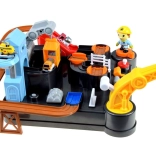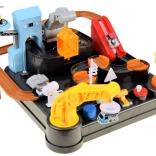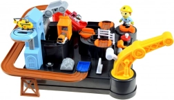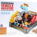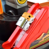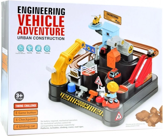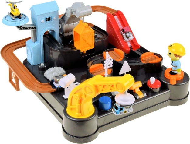 Deze kleurrijke mechanische baan met bouwthema biedt een complete bouwscène met obstakels, lift en een kraan met magneet. Kinderen kunnen voertuigen van laden tot lossen begeleiden, draaitafels en hendels bedienen en zien hoe de autootjes het parcours volgen. De geïntegreerde digitale klok op de toren maakt het mogelijk de rijtijd te meten en speelt na inschakelen een vrolijke melodie.