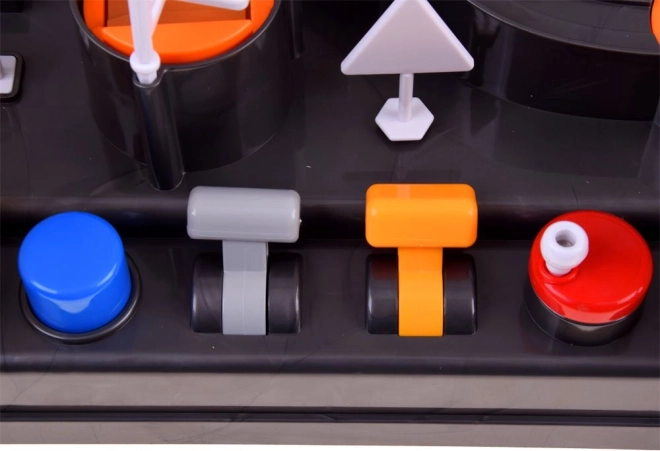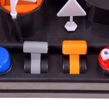 - Draaitafels, hendels, lanceerknop, digitale klok met melodie