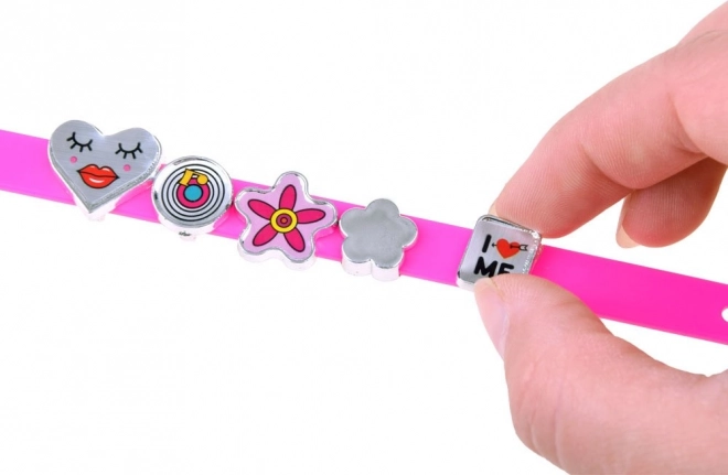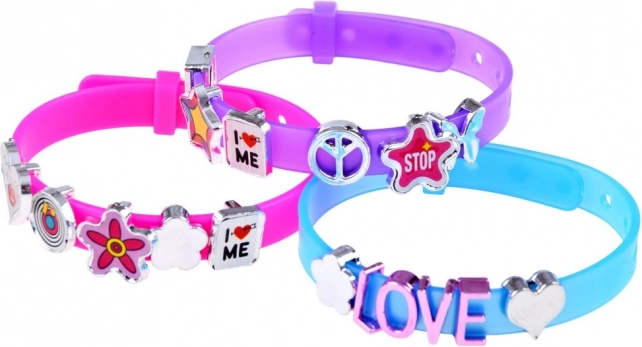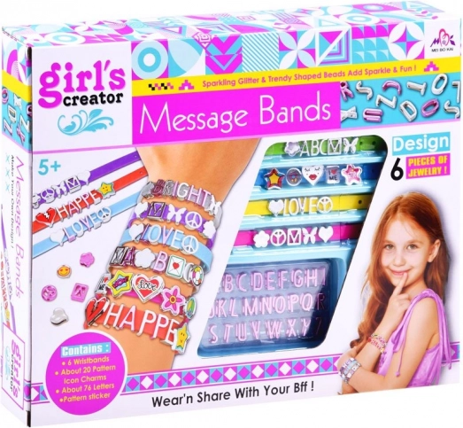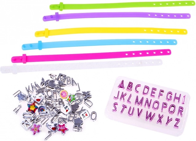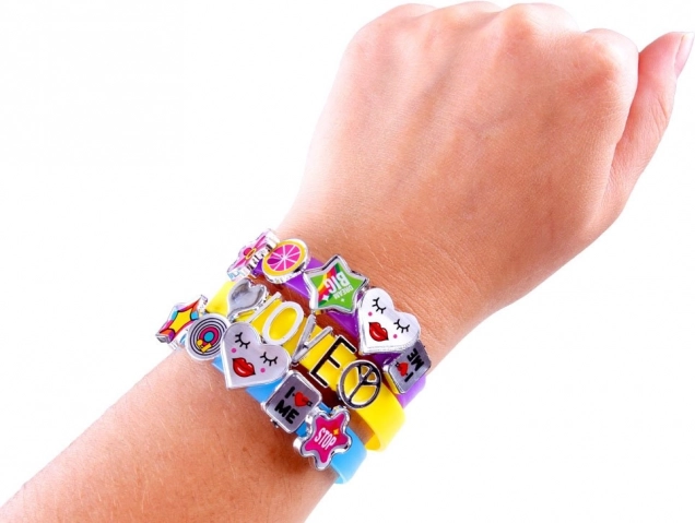 De set bevat banden in levendige kleuren met de mogelijkheid om favoriete decoraties en letters toe te voegen.