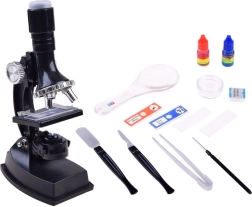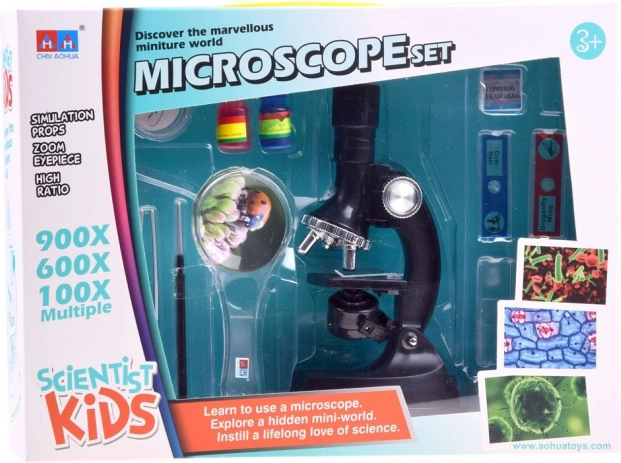 Ontdek de microwereld met deze kindvriendelijke microscoopset met vergrotingen 100×/600×/900×, rijk assortiment accessoires en eenvoudige bediening. Ideaal als educatief hulpmiddel voor school en thuis – stimuleert nieuwsgierigheid, wetenschappelijk denken en fijne motoriek. Voeding via 2× AA-batterijen (niet inbegrepen).