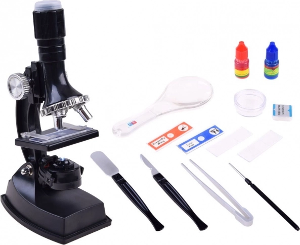 - microscoop, vergrootglas, prikpen, pincet, veilige scalpel, spatel, petrischaal, 2× flesje met kleurstof, 2× kant‑en‑klaar preparaat, 2× leeg objectglaasje, 5× dekglaasje, 5× leeg etiket