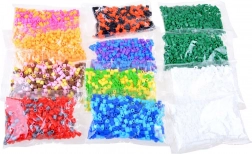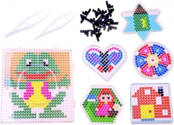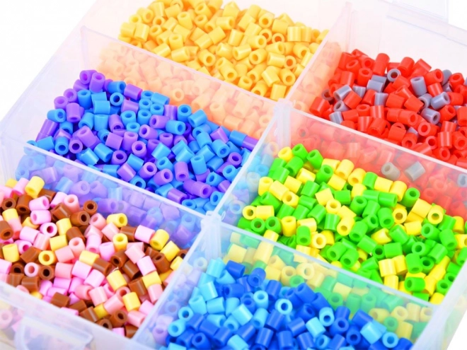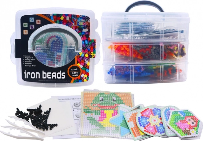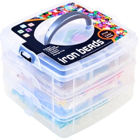 - ca. 6000 strijkkralen, 6 sjablonen, 10 pegboards, 12 zakjes kralen in diverse kleuren, 2 pincetten, 2 vellen bakpapier, opbergbox met vakjes