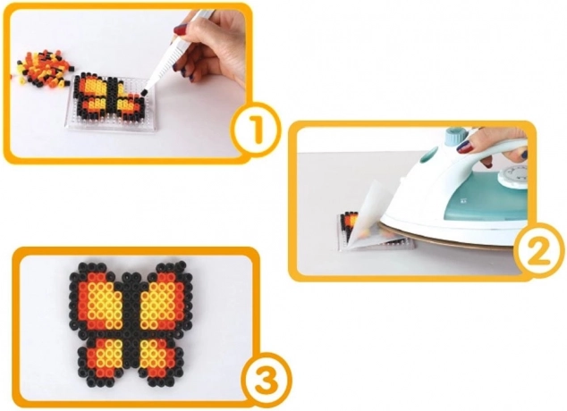 Leg de kralen op het pegboard, dek af met bakpapier en strijk – in een mum van tijd ontstaat een stevige mozaïek, klaar om neer te zetten of te dragen als hanger.