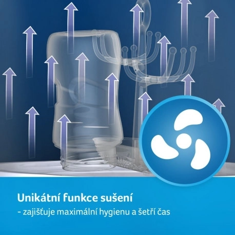 Dankzij de ruime kamer verwerk je tot 4 babyflessen tegelijk en tot 10 stuks accessoires (spenen, fopspenen, deksels enz.). De afneembare houder vergroot de capaciteit, het apparaat is compatibel met de meeste flessen op de markt en voor sterilisatie is slechts 100 ml water nodig. Na afloop van de cyclus schakelt het apparaat automatisch uit voor extra veiligheid en energiebesparing.