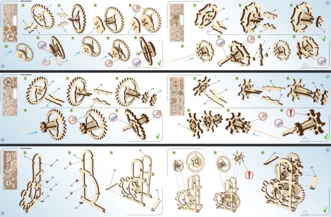 Nauwkeurig uitgesneden onderdelen passen exact in elkaar. Voor minimale wrijving volstaat het om volgens de instructies de assen met gewone kaarsenwas te smeren.