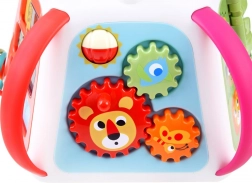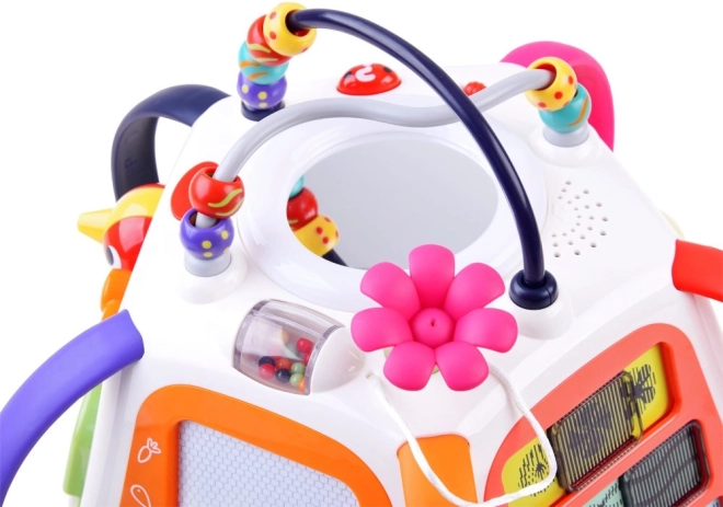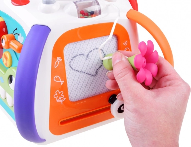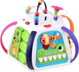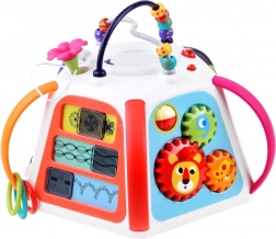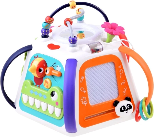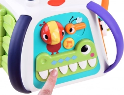 Na het inschakelen activeert de kubus melodieën, geluidseffecten en lichtelementen die kinderen motiveren om verder te ontdekken. Er is ook een piano in de vorm van krokodillentandjes, bewegende onderdelen, schuifpanelen met het optische effect van “levende” animatie en een veilig spiegeltje.