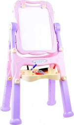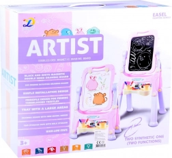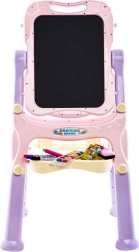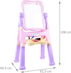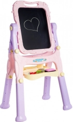 Dit kleurrijke dubbelzijdige bord biedt alles voor kleine kunstenaars: op de zwarte zijde kun je met krijt schrijven, de witte magnetische zijde is geschikt voor drooguitwisbare stiften, magneten of het vastklemmen van papier om op te tekenen. Het praktische plankje en de bekers houden krijt, stiften en kwasten altijd bij de hand.