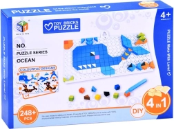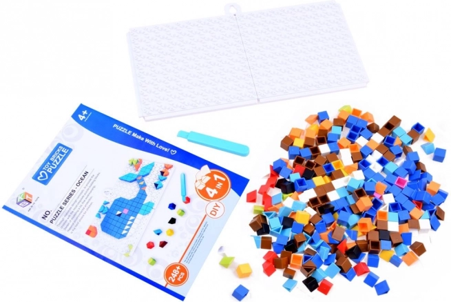 De set bevat 248+ gekleurde blokjes om kleurrijke mozaïeken te maken. Kinderen kunnen motieven leggen aan de hand van voorbeelden (bijv. dieren of oceaanscènes) of hun eigen afbeeldingen bedenken.