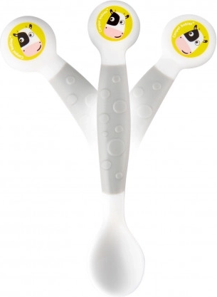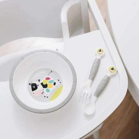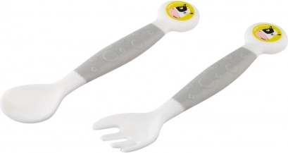 Flexibel bestek in een schattig koedesign (vork en lepel) is gemaakt van een kneedbaar materiaal. Na het vormen behoudt het de gewenste vorm, wat het leren eten voor kinderen die zelf willen eten vergemakkelijkt. Geschikt voor kinderen ouder dan 12 maanden. Het bestek is gemaakt van veilige materialen die bedoeld zijn voor contact met voedsel. Waarschuwing! Buig het bestek om veiligheidsredenen niet in een hoek groter dan 90°. Het bestek is BPA-vrij. Het bestek kan worden gevormd naar de behoeften van het kind – ongeacht of het rechts- of linkshandig is. Afgeronde vormen – aangepast aan gevoelige kindertandvlees. Onderhoudsvoorschrift: Houd schoon. Was voor het eerste en elk volgend gebruik in warm water met een voor kinderen geschikt middel, spoel grondig af en overgiet met kokend water. Gebruik het product niet in de magnetron. Let op! Belangrijk voor de veiligheid en gezondheid van uw kind! Gebruik alleen onder direct toezicht van een volwassene. Controleer het product voor elk gebruik. Gebruik het product niet verder bij de eerste tekenen van slijtage of beschadiging – vervang het door een nieuw exemplaar. Waarschuwing! Laat een kind tijdens het eten nooit zonder toezicht van een volwassene. Controleer altijd de temperatuur van het voedsel dat aan het kind wordt gegeven. Dit product is geen speelgoed. Buiten bereik van kinderen bewaren. Het plastic bestek voldoet aan de eisen van: Verordening (EG) nr. 1935/2004 van het Europees Parlement en de Raad – algemene eisen voor materialen en voorwerpen bestemd om met levensmiddelen in contact te komen; Verordening (EU) nr. 10/2011 van de Commissie betreffende materialen en voorwerpen van kunststof bestemd om met levensmiddelen in contact te komen; EN 14372 Artikelen voor de verzorging van kinderen – Bestek en servies voor voeding – Veiligheidseisen en beproevingsmethoden