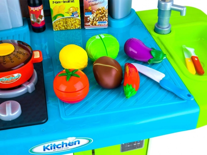 Groenten met klittenband om te snijden, een pan met deksel, koekenpan, borden, kopjes, bestek, een kan en imitatie-eten – alles voor een complete kookhoek.