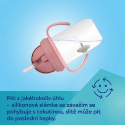 Het siliconen rietje beweegt mee met de vloeistof, zodat het kind comfortabel kan drinken zittend, in de kinderwagen of bij lichte kanteling – tot de laatste druppel.