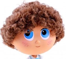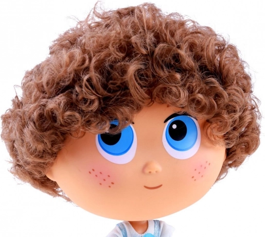 Grote blauwe ogen, subtiele sproetjes en bruine krullen geven de pop een unieke uitstraling en een vriendelijke glimlach.