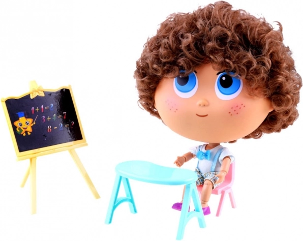 Docent-pop Tymek is ideaal voor kinderen die graag de schoolsfeer nabootsen. Dankzij de schoolaccessoires en realistische details – blauwe ogen, sproetjes, bruine krullen en een stijlvolle outfit met strikje – creëren kinderen gemakkelijk hun eigen klas en verhaaltjes.