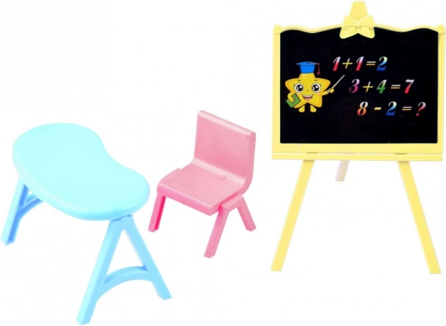 Complete uitrusting voor het spelen van school. Kinderen kunnen op het bord schrijven, de pop aan het tafeltje zetten en hun eigen lessen verzinnen.