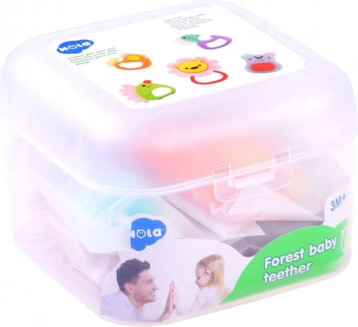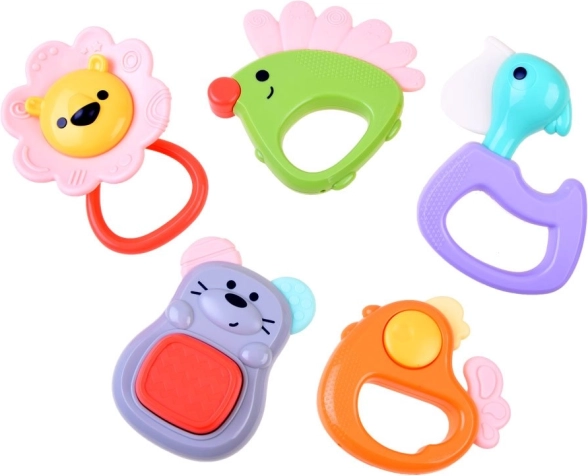 Kleurrijke set bijtringen in de vorm van dieren, ideaal voor de tandjes bij jonge kinderen. De bijtringen zijn licht, makkelijk vast te pakken en helpen de motorische vaardigheden van het kind te ontwikkelen.