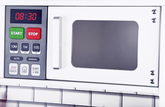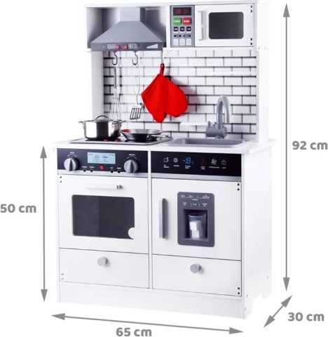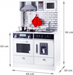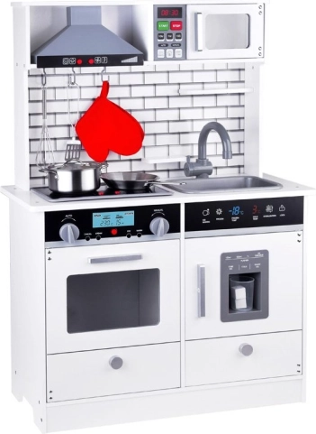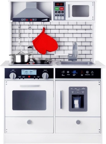 Deze prachtige houten keuken is voorzien van alle benodigde apparaten, waarmee kinderen de lekkerste gerechten kunnen bereiden. Het ontwerp in witte uitvoering met moderne tegels past perfect in elke kinderkamer of keukenhoek.