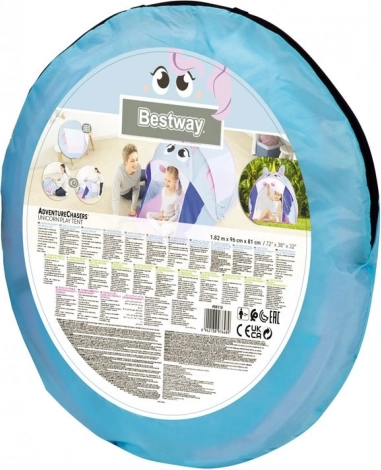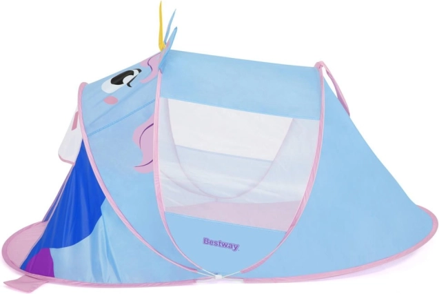 Schattige kinder pop-up tent in de vorm van een eenhoorn van BESTWAY tovert elke kamer, tuin en zelfs het strand om tot een sprookjesrijk. Dankzij het snelle zelfuitklappen, het lichte materiaal en de gaasraampjes voor ventilatie is hij ideaal voor creatief spelen en ontspanning. De bodem zorgt voor een schone en comfortabele speelplek en met de afmetingen 182 × 96 × 81 cm is er genoeg ruimte om te spelen en even uit te rusten.
