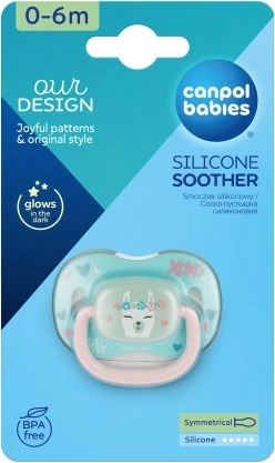 De duurzame constructie van 100% veilige siliconen garandeert een lange levensduur zonder vervorming. Een praktische ring maakt aanreiken en bevestigen aan een lint of ketting eenvoudig. Lichtgevende elementen helpen de speen ook midden in de nacht te vinden. Eenvoudig onderhoud – kan uitgekookt en gesteriliseerd worden.