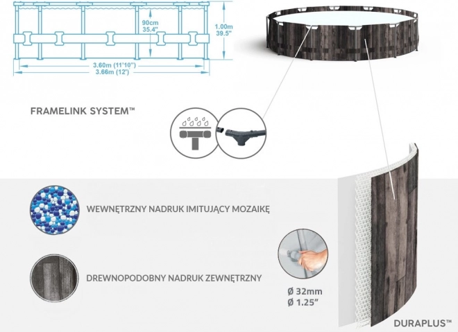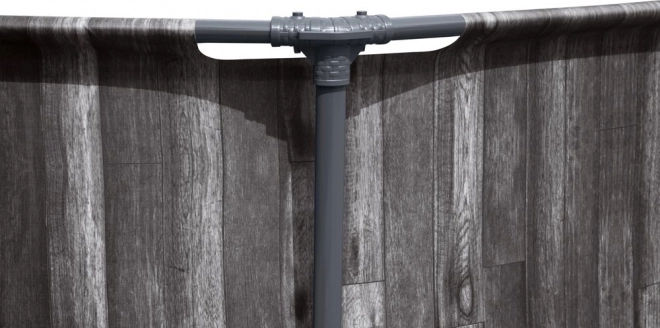 De kuip van het zwembad is gemaakt van het innovatieve DuraPlus-materiaal, bestaande uit een polyester kern en twee lagen sterk PVC, wat uitzonderlijke weerstand en duurzaamheid garandeert. De realistische print van oud hout aan de buitenkant van het zwembad verhoogt de esthetische uitstraling en zorgt voor een stijlvolle integratie in je tuinomgeving.