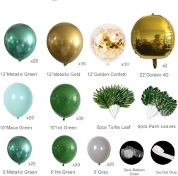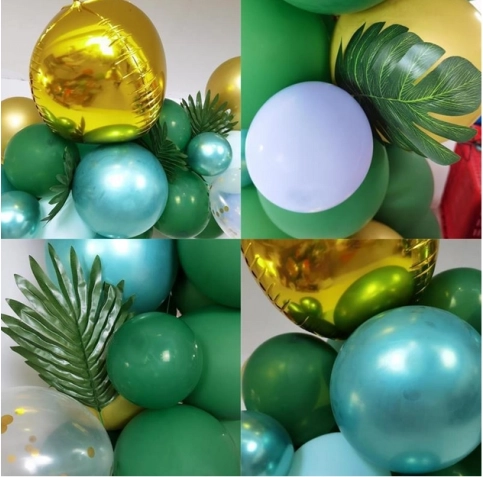 De montage is eenvoudig: vul de ballonnen met lucht of helium en bevestig ze aan het lint met oogjes. Plaats kleinere ballonnen rondom voor een volle, gelaagde look. Tropische en palmbladeren geven het geheel een exotische touch en passen perfect bij het groen-gouden palet.