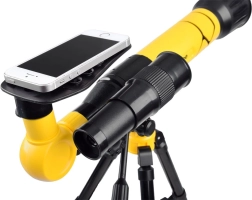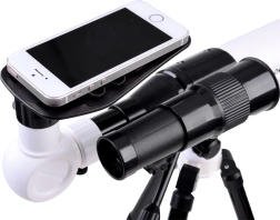 In de verpakking zitten drie oculairs met vergrotingen van 20x / 30x / 40x, een telefoonhouder met zuignappen voor weergave van het beeld op het scherm en een stabiel statief. De buis is aan de buitenkant beschermd met een beschermkap, wat het onderhoud vergemakkelijkt en de optiek schoon houdt.