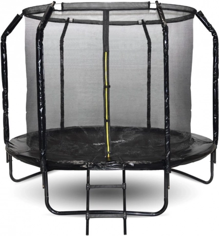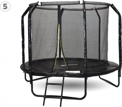 Het springdoek van polypropyleen JUMPING MAT is gestikt met 8 sterke naden, wat de weerstand tegen belasting verhoogt. De geprofileerde metalen palen zijn bedekt met zachte beschermende schuimlaag en de ingang van de trampoline heeft een dubbele bevestiging (rits + gesp). Voor een gemakkelijke instap is er een tweestaps ladder.