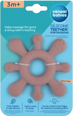 Verschillende texturen en uitsteeksels rondom kalmeren geïrriteerd tandvlees en helpen bij het doorkomen van de eerste tandjes.