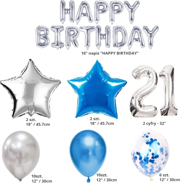 Set van ballonnen voor 21e verjaardag - zilver en blauw