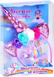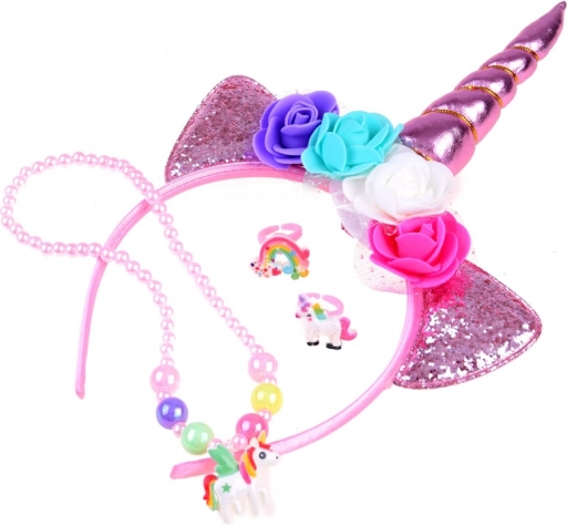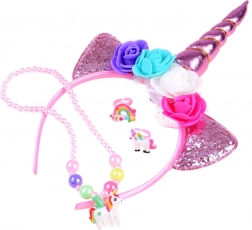 Schattige set voor kleine modeprinsesjes met een eenhoorn-haarband, een kleurrijke ketting en twee ringen. De haarband heeft een zachte, glinsterende hoorn, een satijnen bekleding voor comfort en bloemversieringen. Ideaal voor carnaval, verjaardagsfeestjes en alledaags verkleedspel als feeën en prinsessen. Comfortabel draaggevoel, sprankelende details en een magisch eenhoornontwerp laten elke outfit stralen.