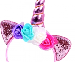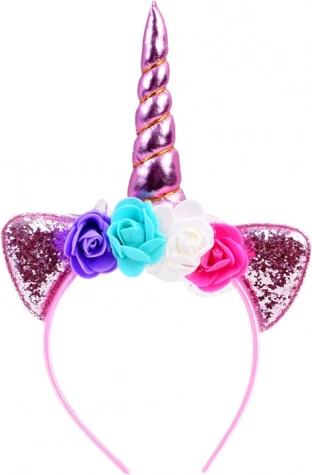 De zachte foamhoorn, sprankelende oortjes en bonte bloemen toveren een unieke eenhoornlook voor elk feestje.